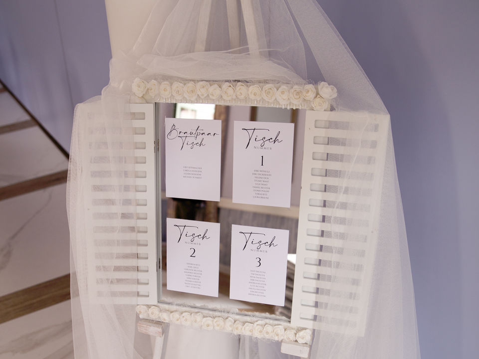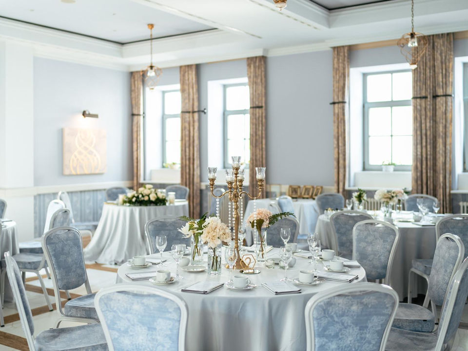 Die Feier wurde im Bankettsaal des Schlosshotels Dresden Pillnitz fortgesetzt. Das stilvolle klassische Interieur des Saals in Grau-Blau-Tönen wurde harmonisch durch goldene Kerzenhalter, perlgraue Tischdecken und Stoffservietten ergänzt.
