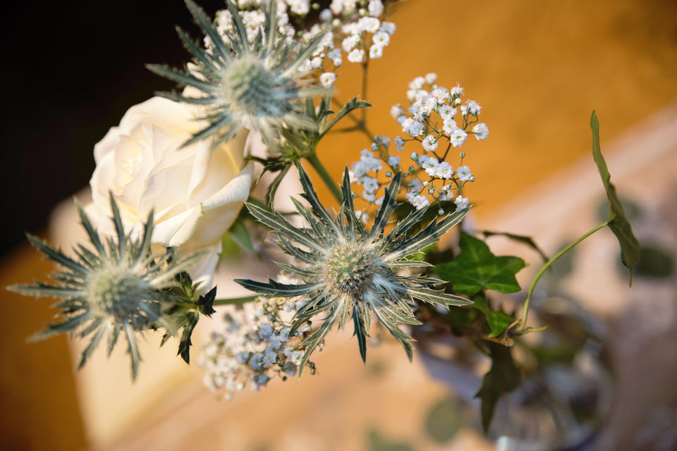 zarte Schleierkraut, Disteln, Eucalyptus und weiße Rosen gewählt.
