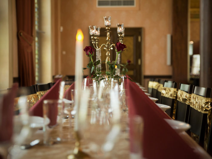 Eine prächtige Lokation, Gold und Bordeaux, klassische Kerzenständer